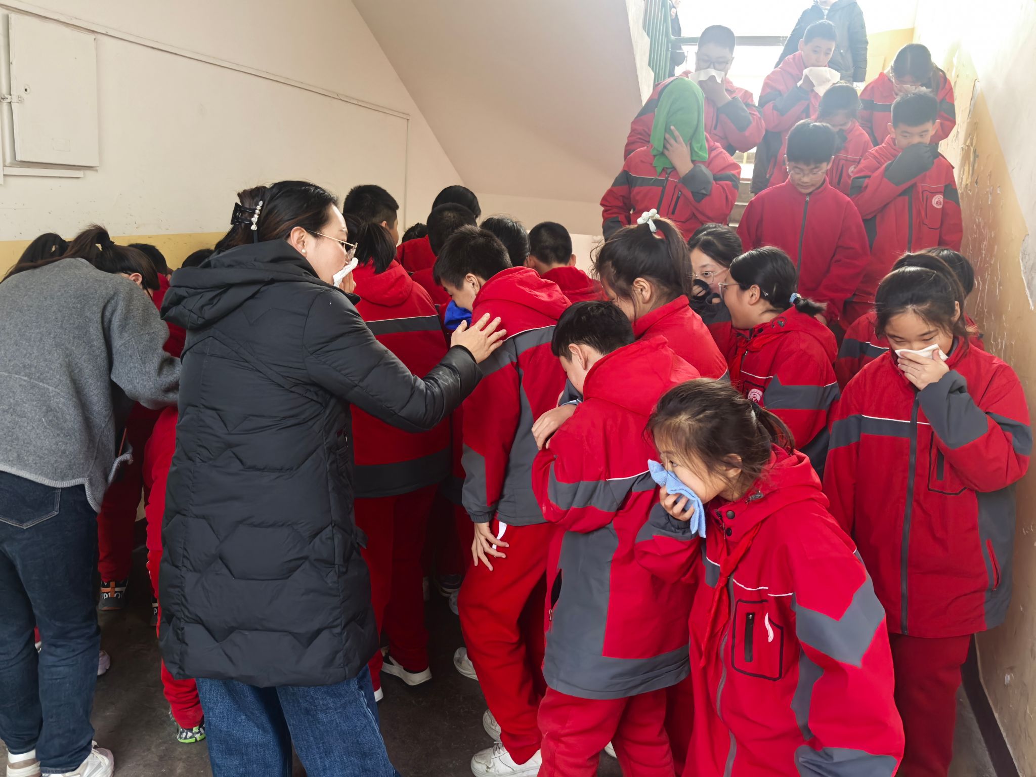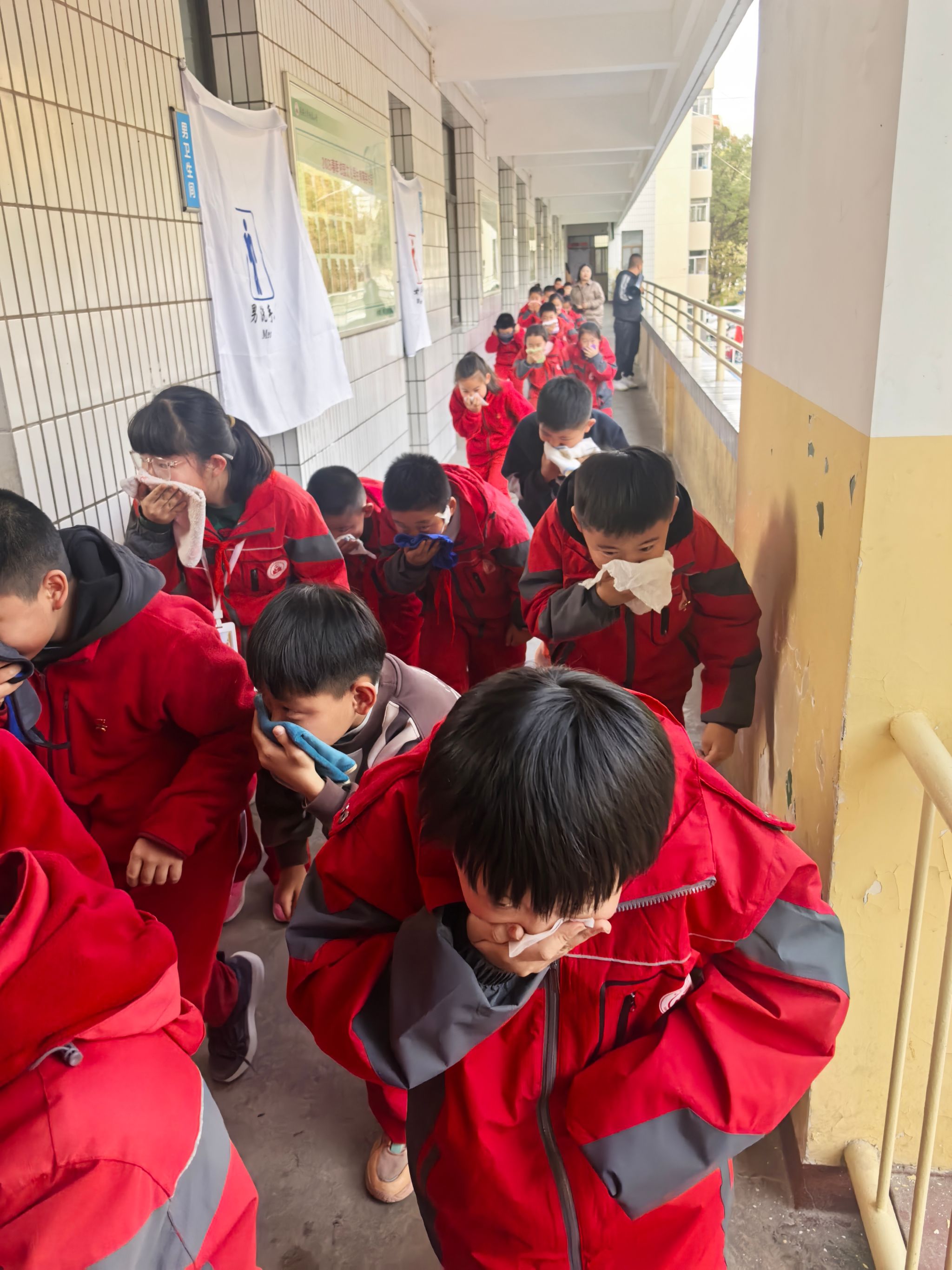 延大附小的活动现场同样氛围热烈。演练正式启动前,工作人员提前抵达教学楼各楼层、楼梯转角、安全出口等关键位置,逐一检查疏散通道是否畅通,明确各自岗位职责——有的负责引导班级队伍,有的紧盯拐角防止拥挤,有的专门帮扶行动较慢的学生。随着模拟火警信号急促响起,浓烟模拟器释放的烟雾迅速弥漫楼道,工作人员立即切换至“实战状态”,用扩音设备高声指引:“大家不要慌!弯腰低头,用湿毛巾捂紧口鼻,沿着墙壁快速前进!”途经楼梯口时,反复提醒“靠右行走,不要推挤,保持安全距离”,并及时纠正个别同学仰头、奔跑等危险行为。在工作人员的科学调度和细致引导下,全体师生沿着预定疏散路线,高效有序地撤离至室外安全区域,整个过程忙而不乱,充分展现了良好的应急协作能力。