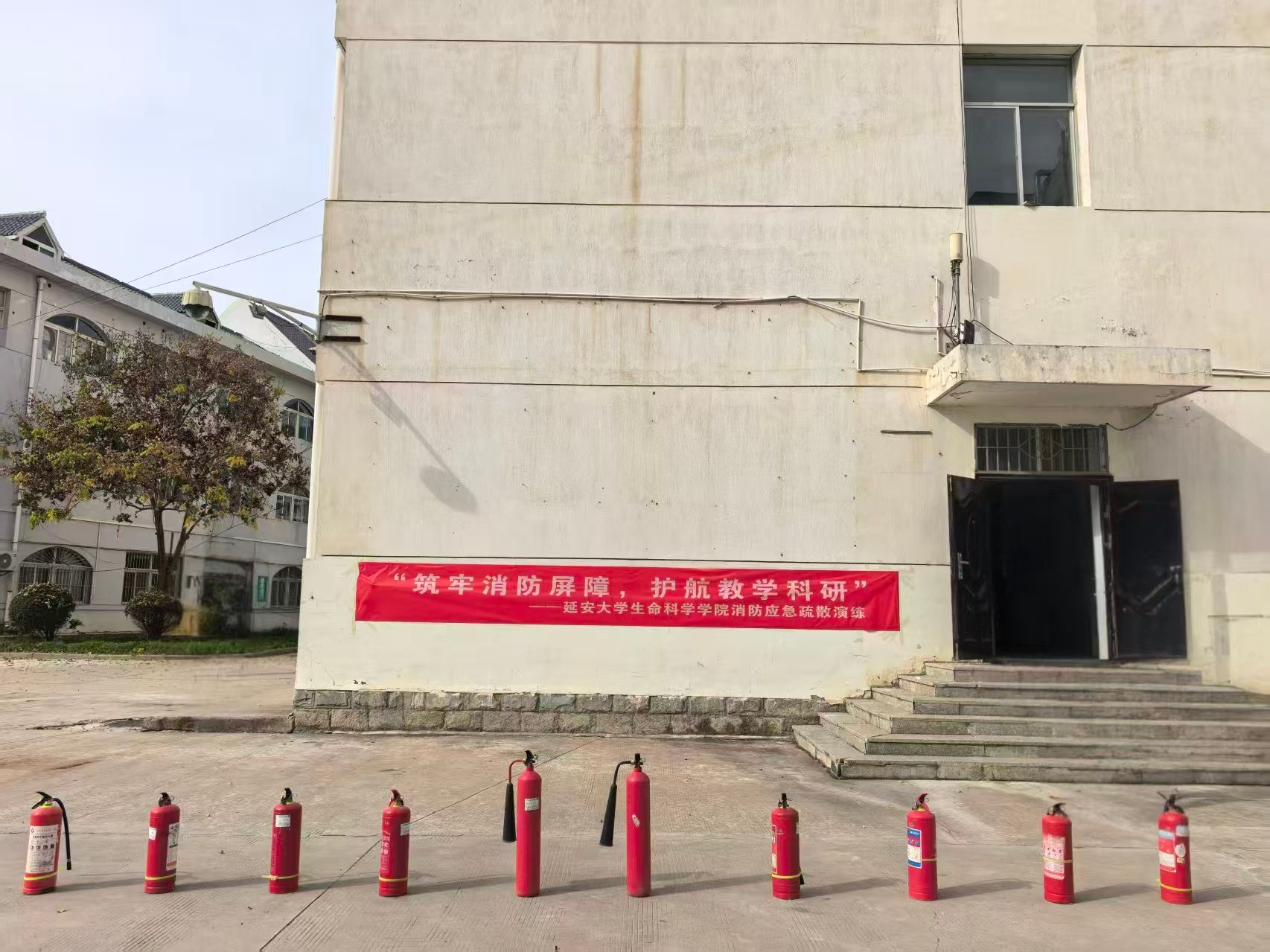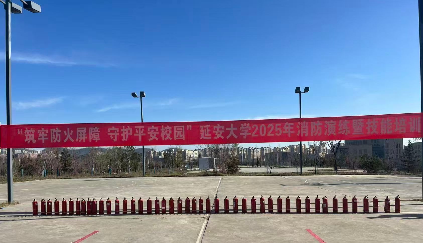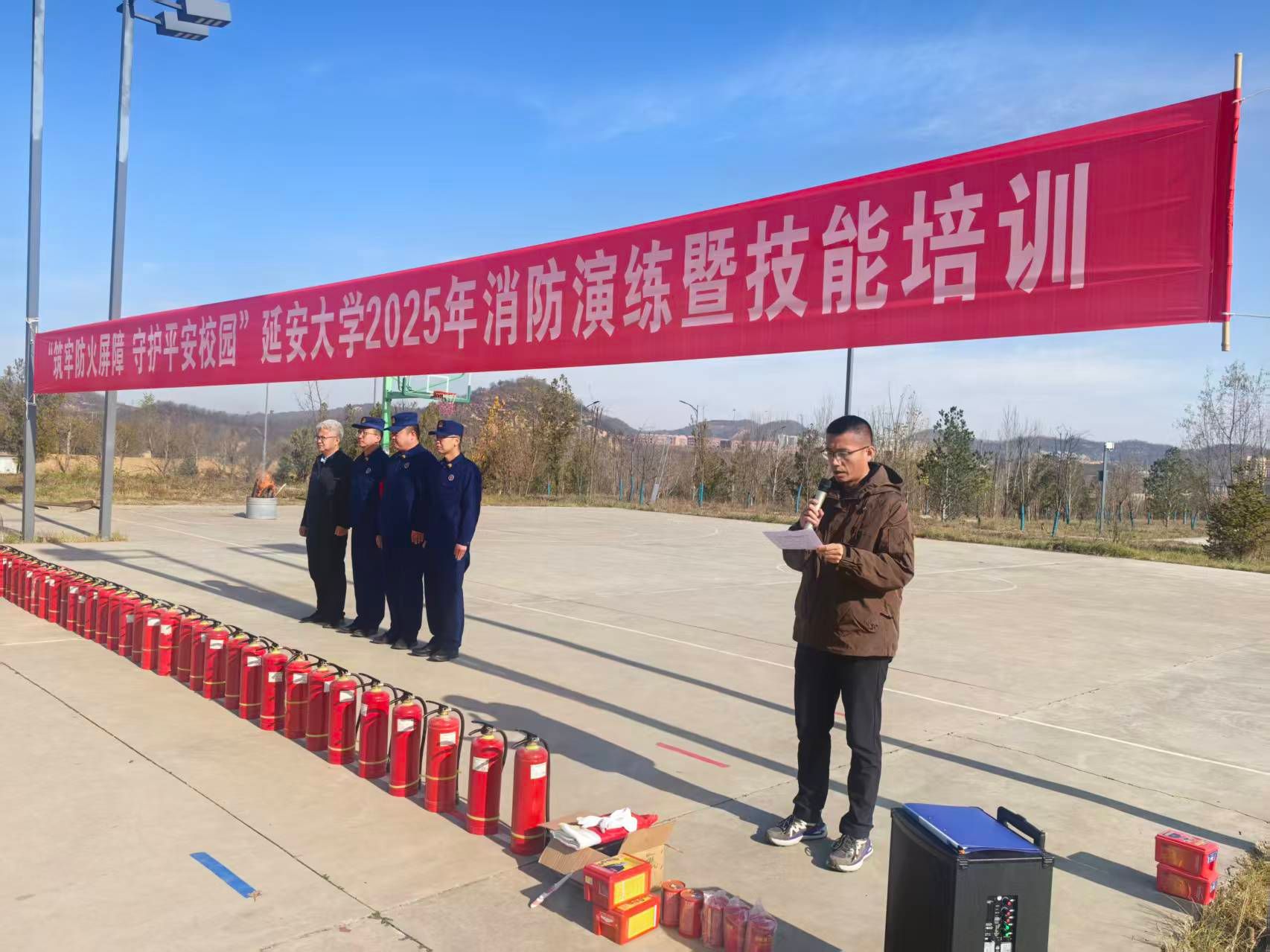 蓝天作伴,红幅醒目——“筑牢防火屏障 守护平安校园”,延安大学2025年消防演练暨技能培训,在冬日晴空下拉开了序幕。一排排整齐的灭火器,是守护安全的“红色卫士”,也预示着这场培训的“干货满满”。
